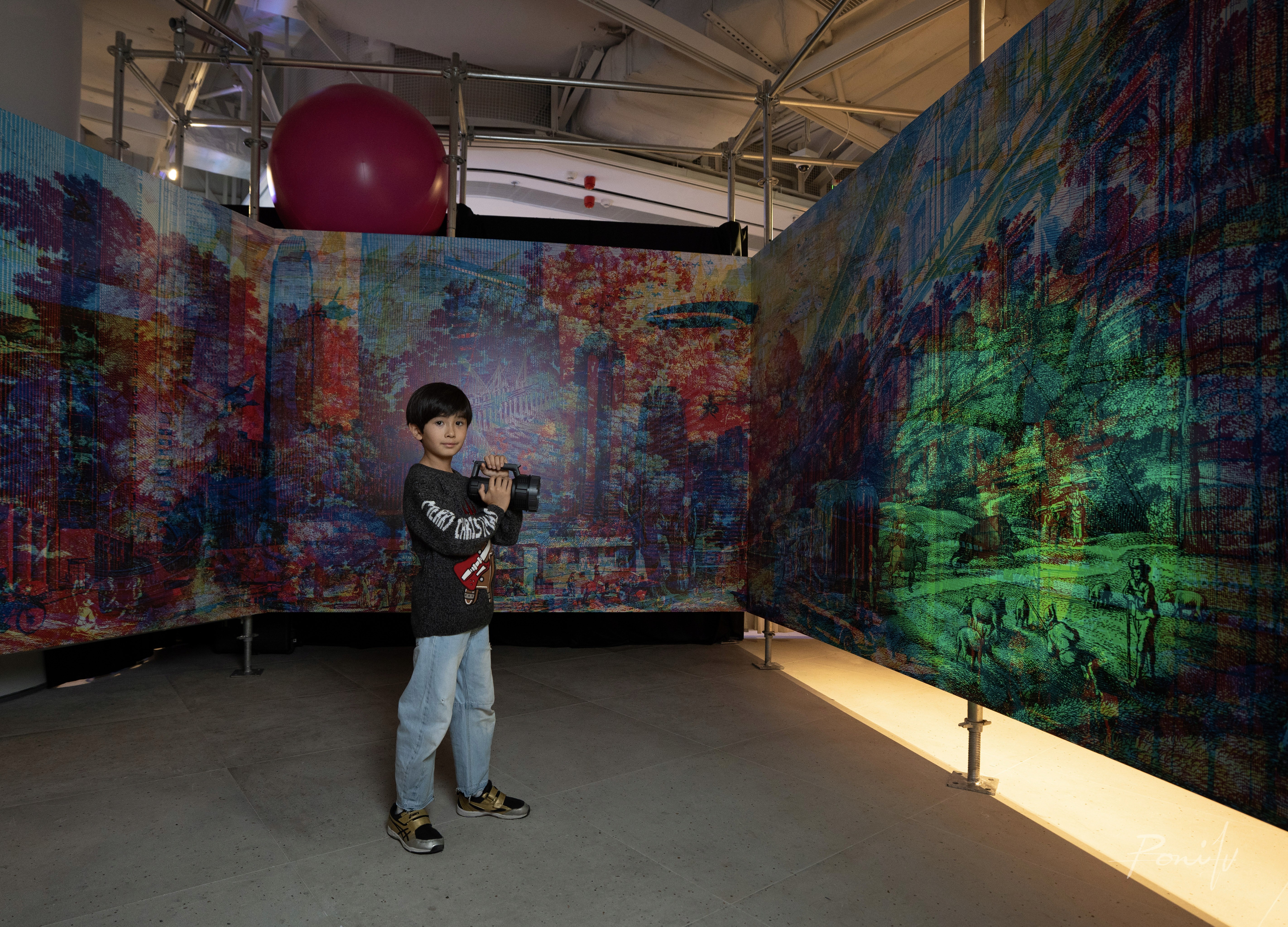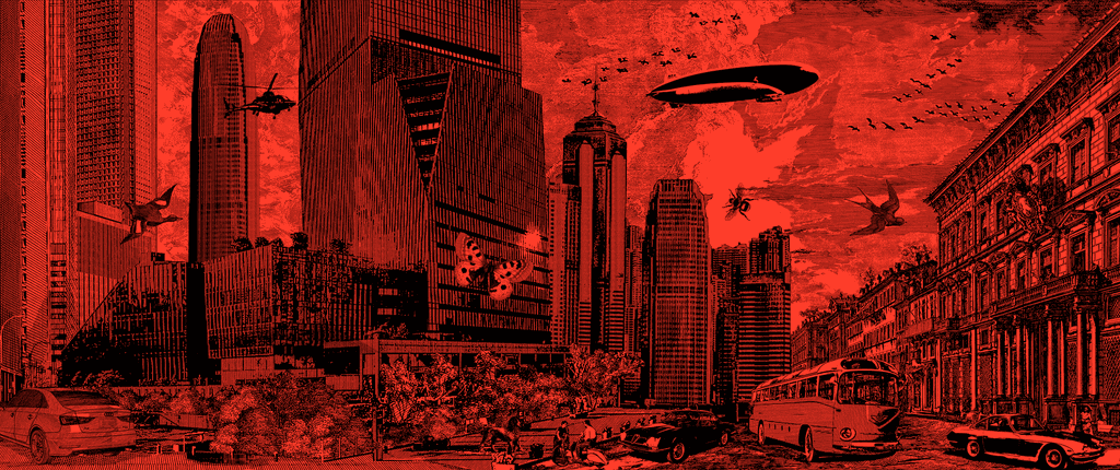 Under red light, an urban landscape emerges, blending architectural elements from an Italian city with those of Hong Kong. It brings together the artists’ hometown and the host city, weaving historical heritage with contemporary life into a single, imagined metropolis.