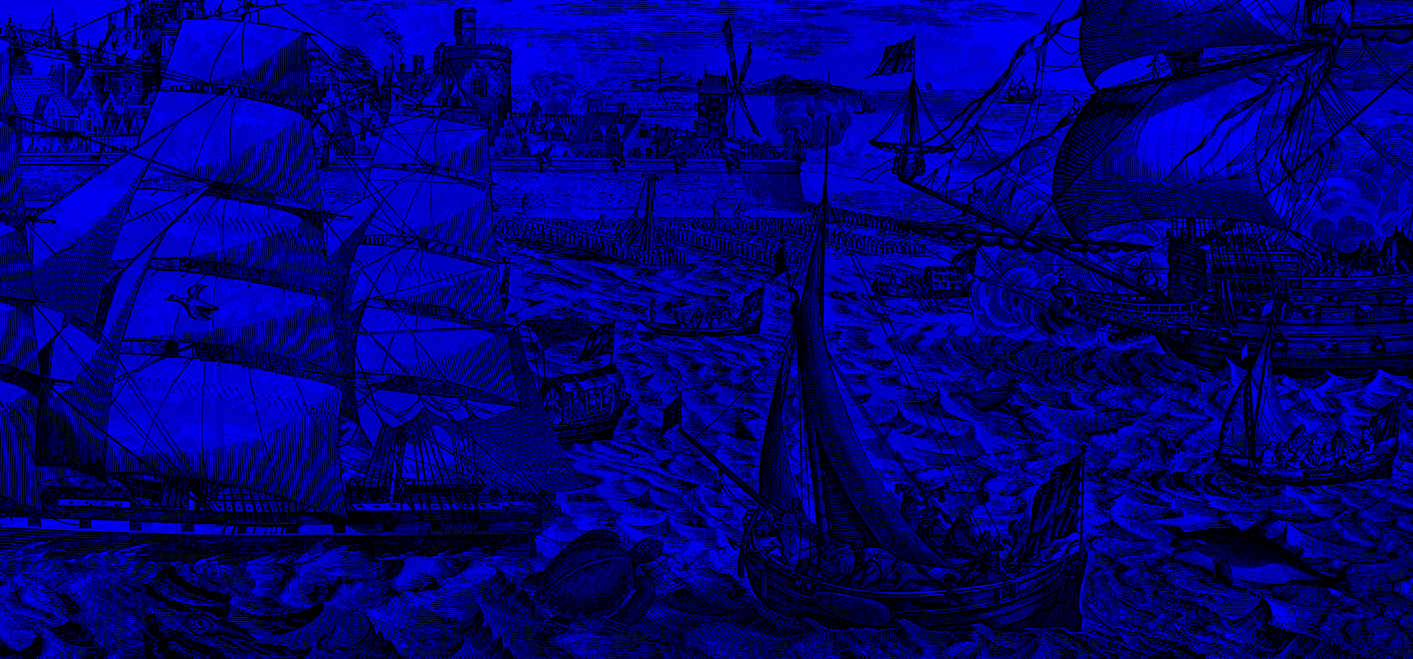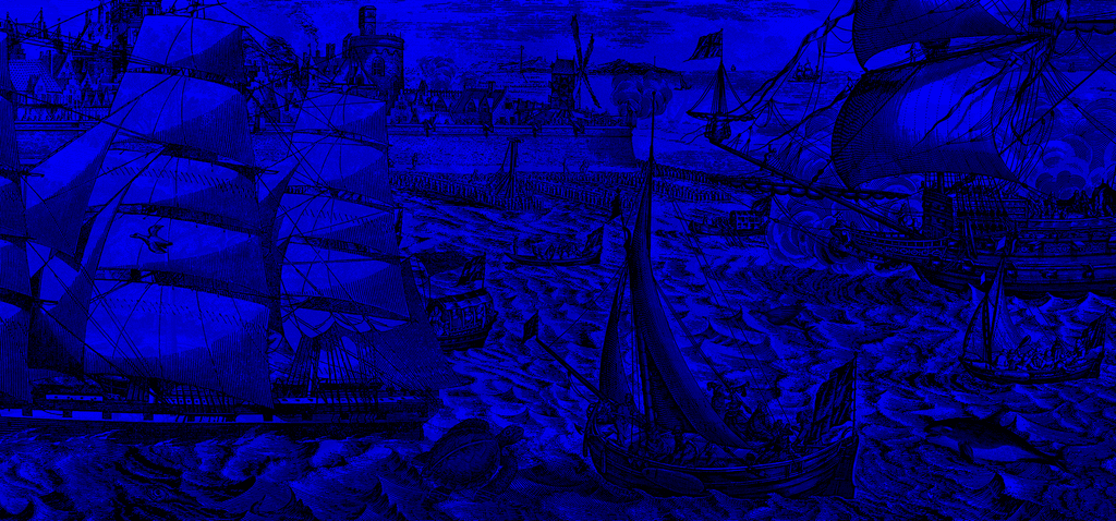 Blue light reveals a marine world filled with ships and vessels. This seascape, shaped by both past and present, symbolically connects East and West, suggesting movement, exchange, and shared histories across water.